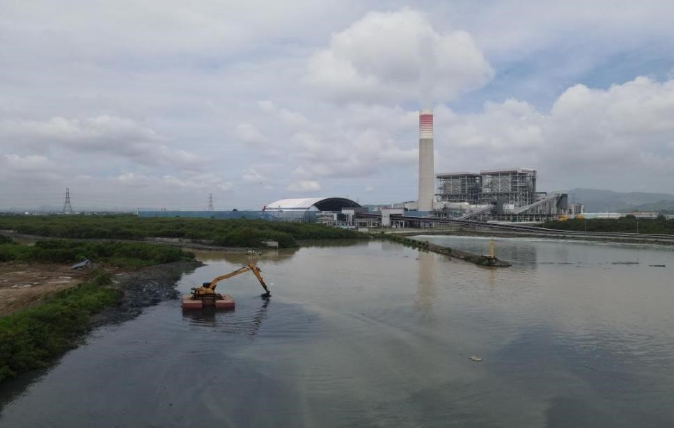 图为恢复畅通后的特拉特河河道与国能印尼爪哇发电公司。国能印尼爪哇发电公司供图